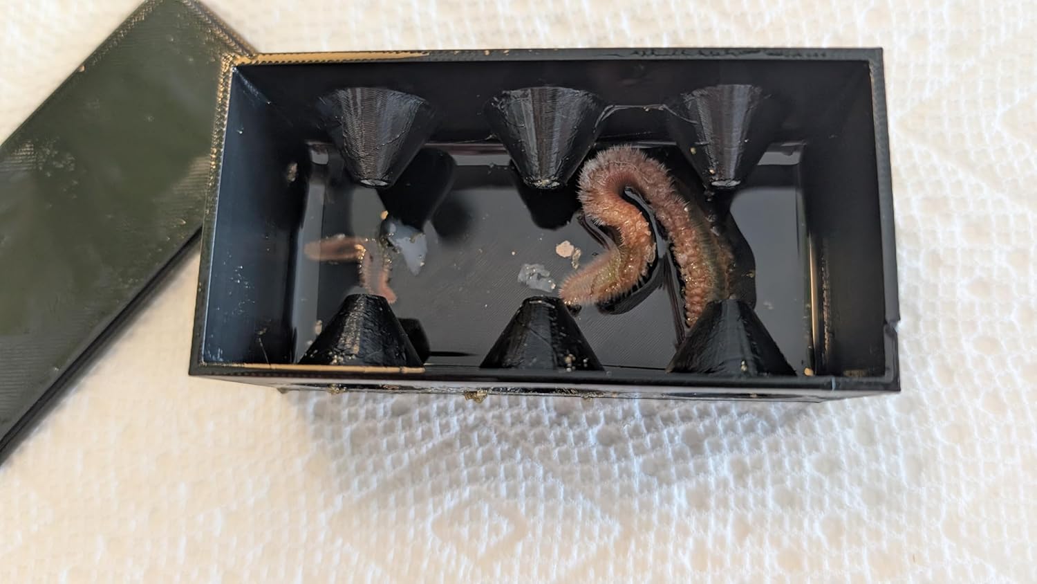 Instructions for use: Place a small aquarium rock inside the trap. Bait with a small piece of shrimp. Place in the aquarium and lock the lid underwater to prevent air bubbles. Place the trap in the bottom of the tank. Leave overnight. On the following day, remove trapped worms. Materials: This trap is made with Reef Safe PTEG plastic.