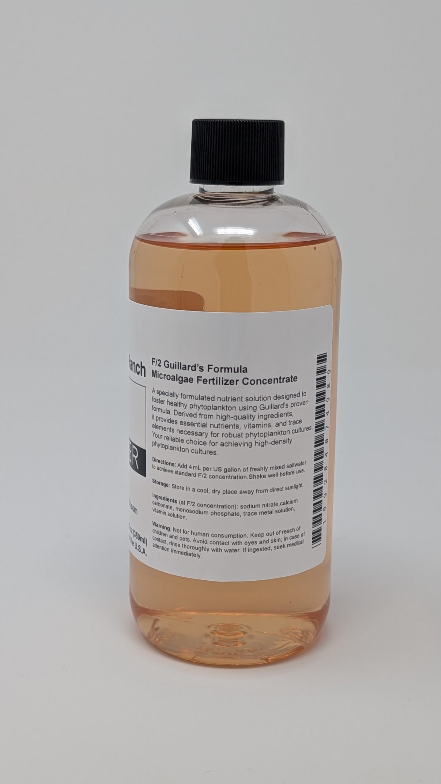 A specially formulated nutrient solution designed to foster healthy phytoplankton using Guillard’s proven formula. Derived from high-quality ingredients, it provides essential nutrients, vitamins, and trace elements necessary for robust phytoplankton cultures. Your reliable choice for achieving high-density phytoplankton cultures. Directions: Add 4?mL per US gallon of freshly mixed saltwater to achieve standard F/2 concentration.Shake well before use. Storage: Store in a cool, dry place away from direct sunlight. Ingredients (at F/2 concentration): sodium nitrate, calcium carbonate, monosodium phosphate, trace metal solution, vitamin solution. Warning: Not for human consumption. Keep out of reach of children and pets. Avoid contact with eyes and skin; in case of contact, rinse thoroughly with water. If ingested, seek medical attention immediately.