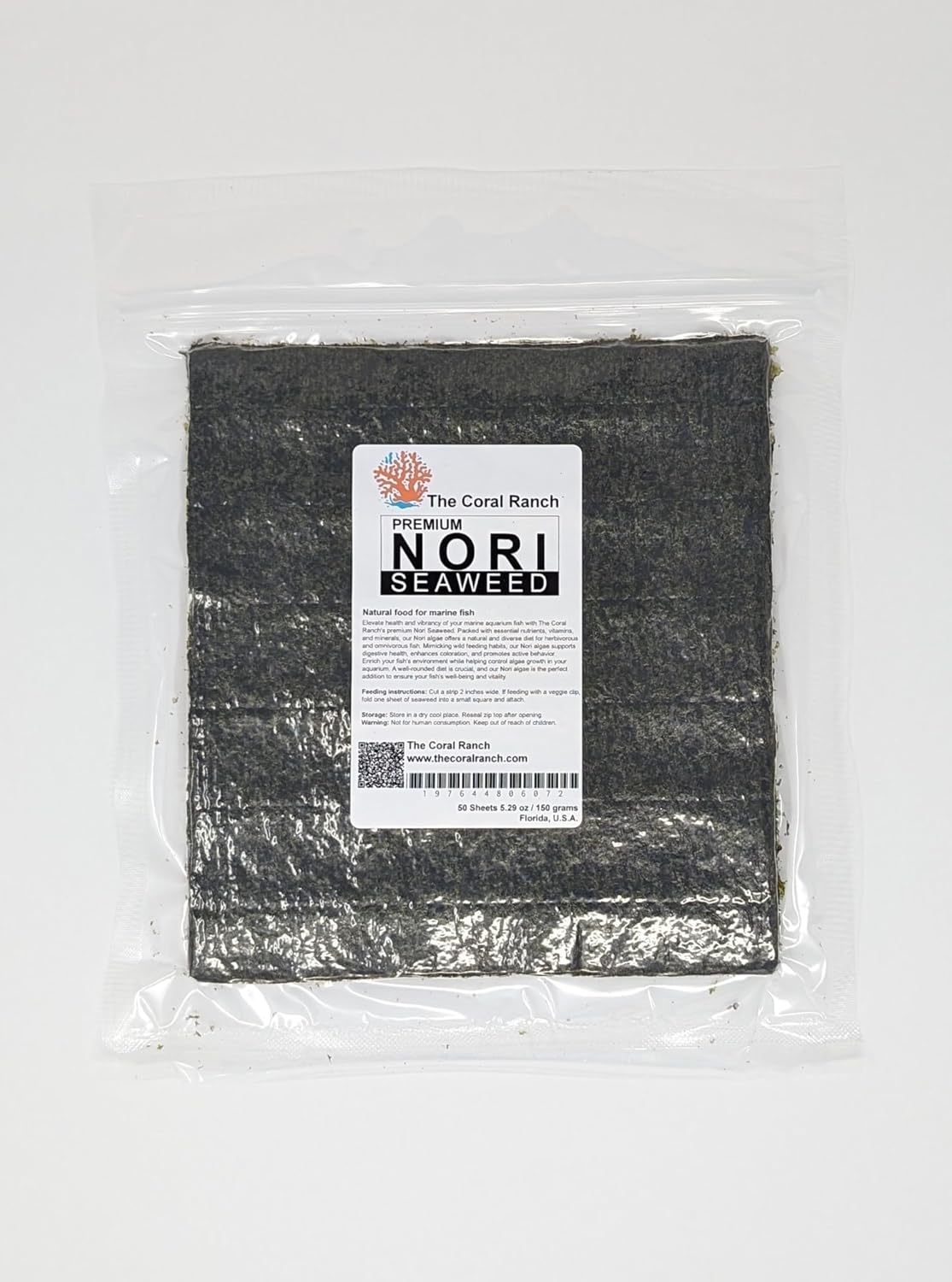 The Coral Ranch – Premium Nori Seaweed – 50 Sheets – Resealable Pack – Food for Marine Fish, Tangs, Butterfly Fish, Angelfish. (150 Gram) / 5.29 oz
